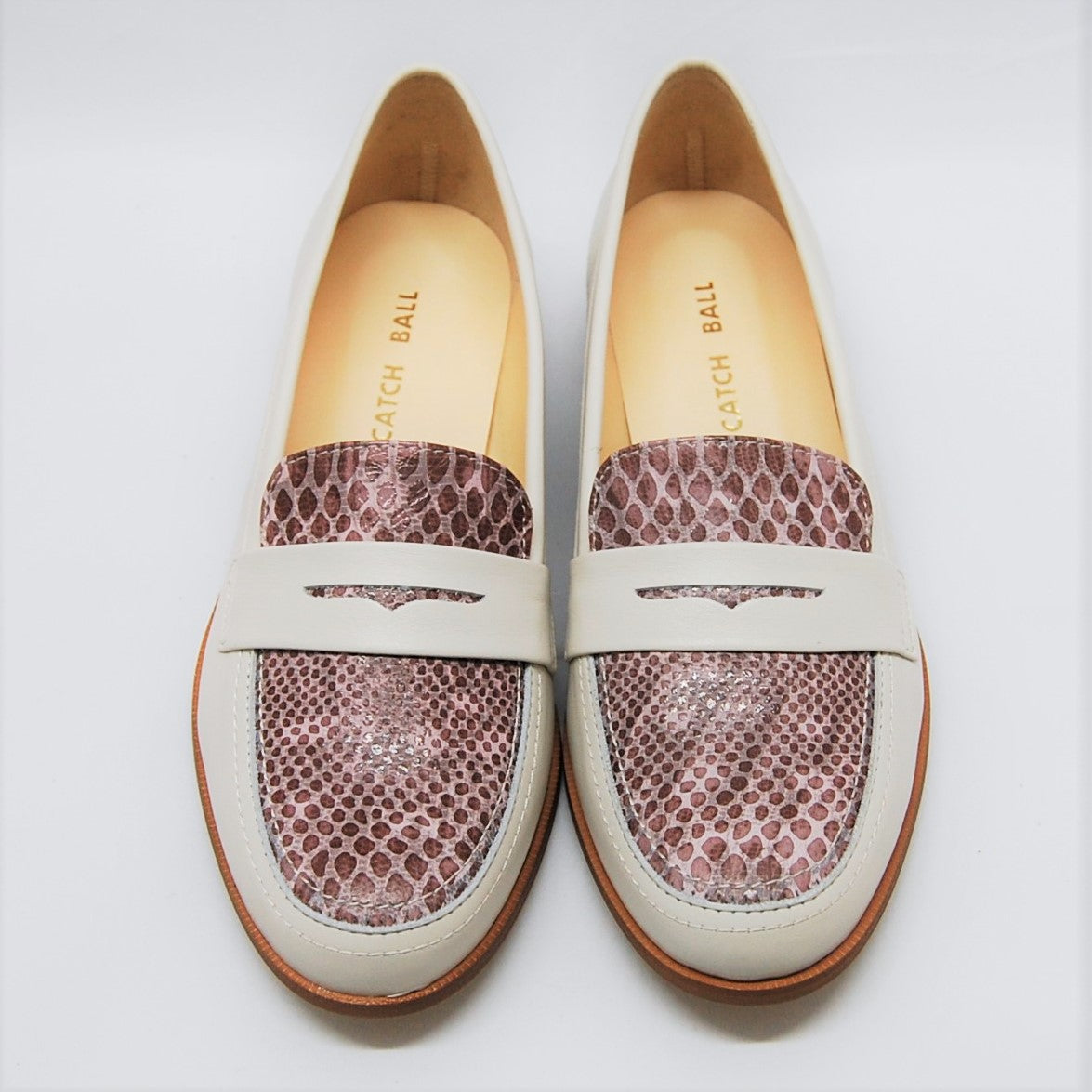 マニッシュすぎないスタンダードなローファーに独自の個性を施した京都発彩り鮮やかな日本製ローファーブランドキャッチボールの限定モデルです。シーンを選ばないデザインにアイボリーをベースにヘビ柄をアクセントとして効かせたコンビローファー。